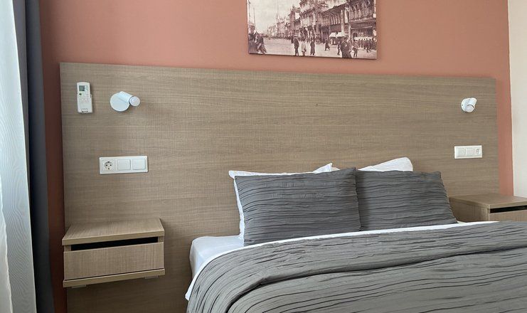 В номере: кровать двуспальная, прикроватные тумбочки, стол, стулья, диван, шкаф, сейф, сплит-система, телевизор, телефон, холодильник