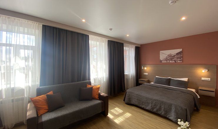 В номере: кровати односпальные /одна двуспальная кровать, прикроватные тумбочки, стол, стулья, диван, шкаф, мини-кухня, набор посуды, сейф, сплит-система, телевизор, телефон, холодильник, чайный набор посуды, электрическая плита, электрочайник