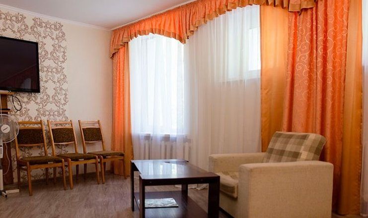 В номере: кровать двуспальная, прикроватные тумбочки, шкаф, мягкая мебель, телевизор, холодильник, чайный набор посуды