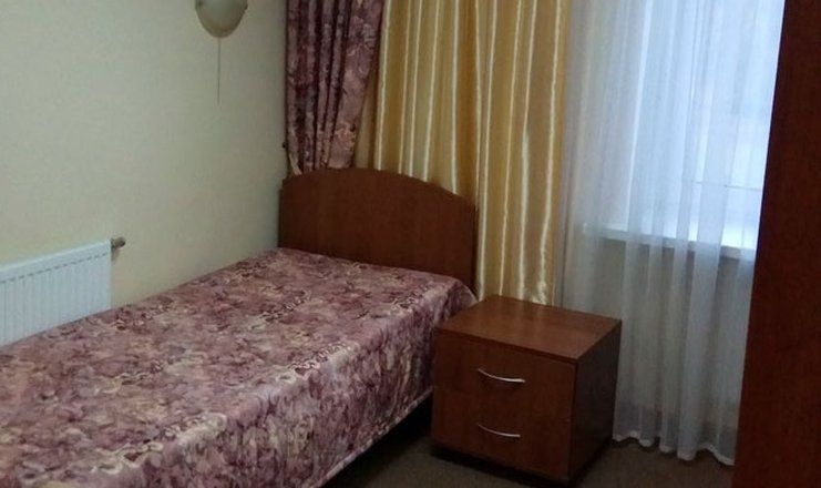 В номере: кровать односпальная, прикроватная тумбочка, шкаф, телевизор, холодильник, чайный набор посуды