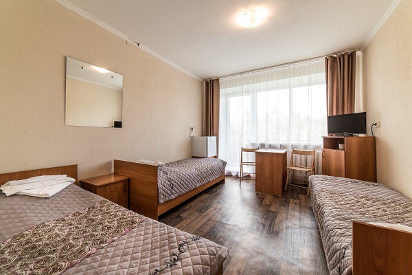 В номере: две или три односпальные кровати, прикроватные тумбы, шкаф, журнальный столик, телевизор, холодильник, чайный набор посуды, электрочайник