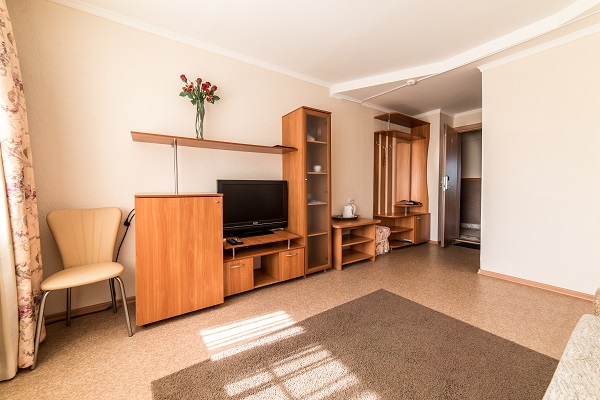 В номере: две комнаты: спальня и гостиная, две односпальные кровати, прикроватные тумбы, шкаф, журнальный столик, раскладной диван, стенка, телевизор, холодильник, чайный набор посуды, электрочайник