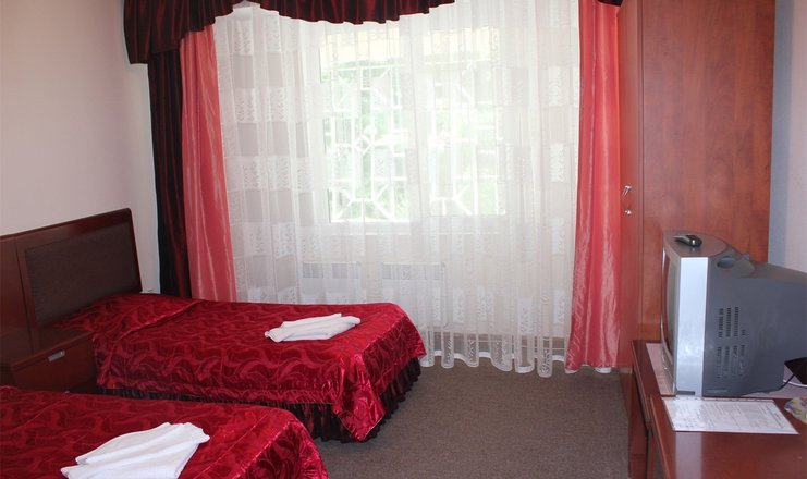 Оснащение номера: кровати односпальные, прикроватные тумбочки, стол, стулья, шкаф, телевизор, холодильник